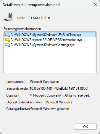 In de detailweergave van het stuurprogramma is te zien dat het bestand nvmedisk.sys daadwerkelijk onderdeel is van de actieve driverstack. Daarmee is te bevestigen dat Windows de nieuwe NVMe-driver gebruikt, ondanks dat de bestandsversie en herkomst volledig binnen de standaard Windows-installatie blijven.