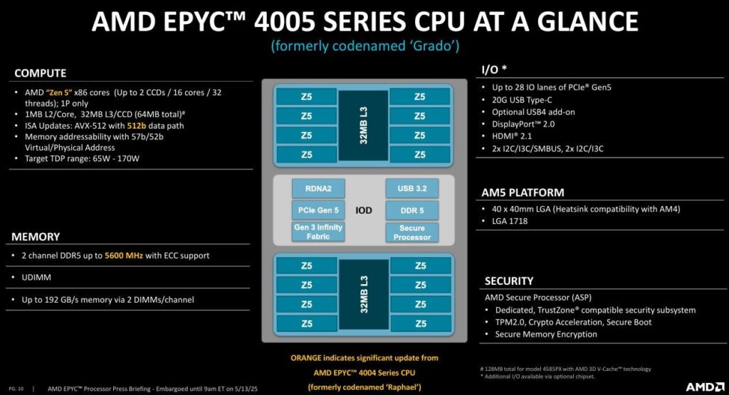De Epyc 4005-serie is gebaseerd op de Zen 5-architectuur en bedoeld voor systemen met één socket. In tegenstelling tot de eerder uitgebrachte Epyc 4004-serie, biedt deze nieuwe lijn ondersteuning voor DDR5-geheugen met een hogere (5600 MHz) snelheid. Daarnaast is de bandbreedte voor  AVX512-bewerkingen nu 512 bits, maar kunnen meerdere instructies met lagere nauwkeurigheid tegelijk worden verwerkt. Daardoor kunnen dubbel zoveel instructies tegelijk worden verwerkt als bij vergelijkbare Intel-cpu’s.