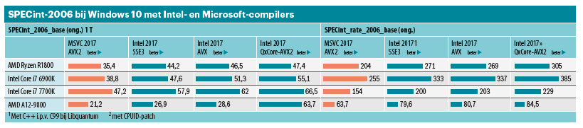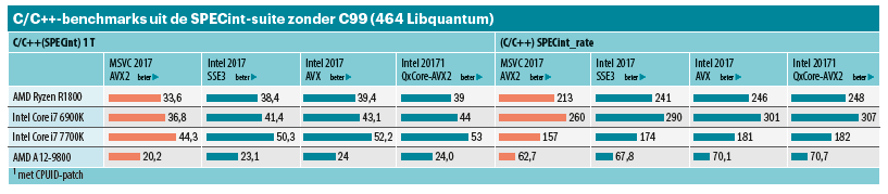 AMD’s Ryzen is in eerste instantie bedoeld voor desktopgebruik. Daarom richten we ons vooral op de gangbare Windows 10-omgeving. Om code te genereren wordt onder Windows Microsofts Visual Studio-compiler het meest gebruikt. Ruim 90 procent van de gangbare Windows-software wordt met (unmanaged) MSVC-C/++ gemaakt. Intels compiler tref je onder Windows zelden aan, maar bijvoorbeeld wel bij Photoshop CC en de Cinebench-benchmark. Verder testen we met de CPU2006-suite. Die test de integerperformance met gangbare desktoptoepassingen zoals schaken, comprimeren, H.264 (de)coderen enzovoorts. Omdat de volledige broncode van de CPU2006-software beschikbaar is, kan die altijd met de nieuwste compilers voor de nieuwste architectuur gecompileerd worden.