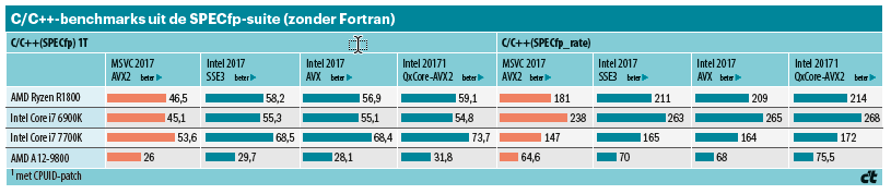 De floatingpointsuite van CPU2006 bevat hoofdzakelijk Fortran-programma’s, maar ook zeven wetenschappelijke C/ C++-programma’s. Zoals gewoonlijk testen we uitsluitend met 64-bit code, zonder automatische parallellisatie en zonder speciale commerciële Heap-bibliotheken. Bij automatische parallellisatie krijg je namelijk geen bruikbare waarden voor single-threads en juist die geven inzicht in het aantal ‘Instructions per Clock’ (IPC). We willen juist antwoord op de vraag of Ryzen daadwerkelijk 52 procent meer instructies per kloktik verwerkt dan voorganger Excavator. En hoe doen Broadwell-E en Kaby Lake het? Dat testen we met de Microsoftcompiler.