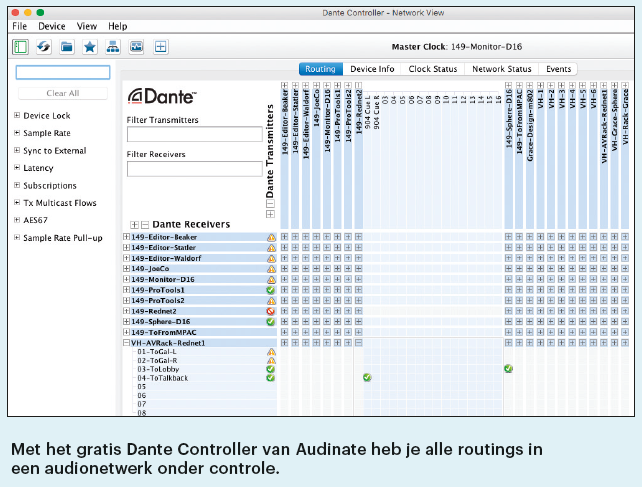 De meest voorkomende apparaten in een audionetwerk zijn digitale mengpanelen en stageboxen. Het gaat daarbij om met audio-interfaces vergelijkbare AD-converters die op het podium gebruikt worden. Maar ook intercomstations, hardwarerecorders, eindversterkers, actieve luidsprekers, draadloze microfoons en computers zijn met elkaar te verbinden. Voor je computers heb je alleen de Via-software van Dante-uitvinder Audinate nodig. Die kost 50 dollar, dus dat is zelfs voor amateurmusici nog wel betaalbaar.