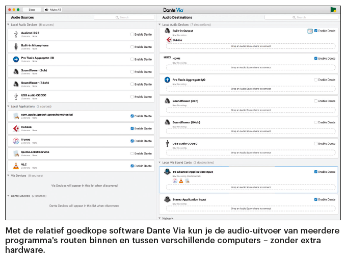 Dante heeft niet alleen wat te bieden voor professionals, maar ook voor ambitieuze hobbyisten. Met de beide softwaretoepassingen Dante Via en Dante Virtual Soundcard, die je bij Audinate gebundeld voor 60 dollar kunt kopen, maak je van je Mac of pc een voor Dante geschikt apparaat. Dat is eenvoudig via de ethernetpoort in het netwerk te integreren. Beide programma’s stellen daar een virtuele Dante-audio-interface voor beschikbaar.