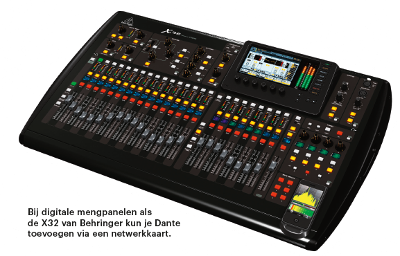 Een aantal professionele apparaten ondersteunt Dante inmiddels standaard al voor audio over ethernet. Bij andere apparaten kun je dat voor elkaar krijgen door een Dante-interface in te bouwen, zoals bij het digitale mengpaneel X32 van Behringer en de DL32R van Mackie.