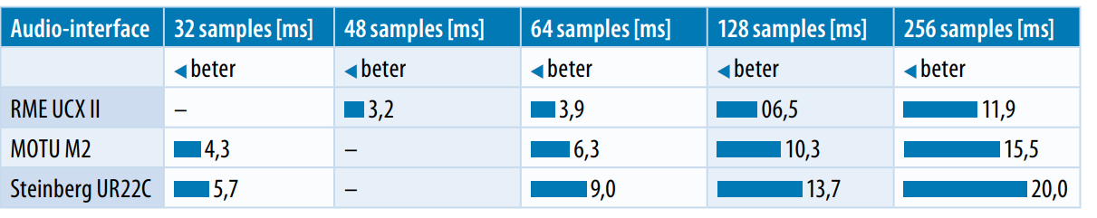 Hoewel deze twee interfaces al beschikbaar zijn in hun meest eenvoudige configuratie met twee kanalen, en dit voor prijzen tussen de 150 en 220 euro, vereist de RME Fireface UCX II een aanzienlijke investering van 1400 euro. Desalniettemin krijg je voor deze prijs acht analoge in- en uitgangen, evenals de ingebouwde digitale recorder genaamd DURec. Bij de vergelijking van de latentie, uitgevoerd met behulp van de gratis RTL Utility van Oblique Audio, komt de RME als beste uit de test. Terwijl de MOTU met standaardinstellingen werkt met een bereik van 70 tot 119 samples, en de Steinberg zelfs tussen de 104 en 220 samples toevoegt aan de door de gebruiker instelbare buffergroottes van 64, 128 en 256 samples, voegt de RME slechts 29 samples toe aan de vertraging.