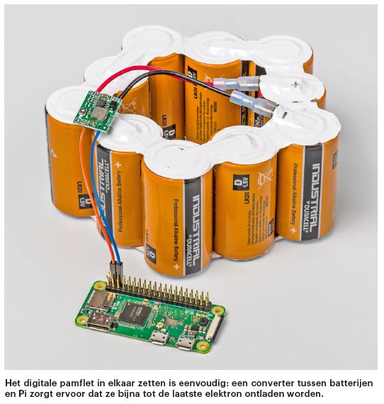 De Raspberry Pi Zero W schaf je voor 11 euro aan bij aanbieders als Kiwi Electronics en SOS Solutions. Voor aansluiting op de batterij(en) moet je nog een DC/DC-converter kopen die een stabiele spanning levert. Die kost zo’n 5,50 euro. Via Marktplaats of Chinese webshops vind je ze zelfs nog veel goedkoper. Met een geschikte converter kun je kiezen uit allerlei batterijen, van een set knoopcellen die een paar uur stroom levert tot een monoblock dat het wel een maand volhoudt.