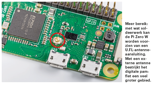 Er zijn nog meer punten die je kunt verbeteren. De interne antenne van de Zero W heeft niet veel bereik, maar op de printplaat zit een contact voor een U.FL-antenne-aansluiting. Als je goed kunt solderen, voeg je zo’n aansluiting toe en vergroot je het bereik met een externe antenne. Daarmee wordt lokaliseren van het digitale pamflet ook moeilijker, omdat de ‘actieradius’ en daarmee het aantal verstopplekken groter is.