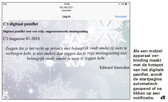 Er kleven risico’s aan vrije meningsuiting. Het kan zelfs gevaarlijk zijn. Moderne dissidenten verspreiden hun pamfletten digitaal via internet, maar repressieve overheden blokkeren ze en beperken de vrijheid van meningsuiting. Met een Raspberry Pi en een batterij maak je een digitaal pamflet om anoniem ongecensureerde boodschappen te verspreiden via wifi en Tor.