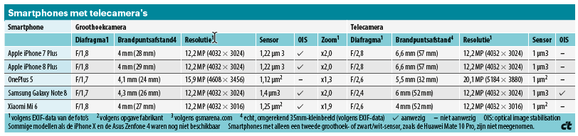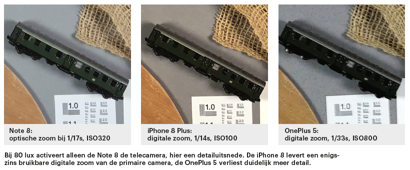 De beste telecamera bleek die van de Galaxy Note 8. Die was bij 80 lux nog steeds actief. Daarbij profiteert de Samsung ervan dat hij het grootste diafragma heeft. Bovendien is het de enige smartphone uit de test waarbij ook de telecamera optische beeldstabilisatie heeft. Daarmee schiet hij de 80-lux foto met 1/17 seconde en ISO320. De iPhone 8 Plus geeft de niet gestabiliseerde telecamera maximaal 1/50 seconde bij ISO320 en 200 lux.