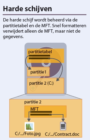 Getuige: Precies. In werkelijkheid maak ik bij snel formatteren alleen maar een nieuwe inhoudsopgave van het bestandssysteem aan, de zogenaamde Master File Table of MFT. Dat betekent dat de originele gegevens allemaal nog aanwezig zijn, maar niet meer kunnen worden gelokaliseerd omdat er in de nieuwe MFT niet meer naar verwezen wordt. U kunt het vergelijken met de populaire cassettebandjes van vroeger: wanneer je een bandje ‘leeg’ maakte, streepte je alleen het etiket door en gooide je het inlegvelletje met de inhoudsopgave weg. Alle muziek bleef er echter gewoon op staan.