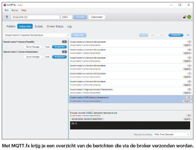 Op het tabblad ‘Subscribe’ abonneer je je op een willekeurig topic (of direct op alle topics met #). Op het tabblad ‘Publish’ verstuur je zelf berichten, die je als het goed is weer terugziet in het venster ‘Subscribe’. Als je een tweede computer bij de hand hebt, die pas later verbinding maakt, kun je de werking van de retain-vlag makkelijk testen.