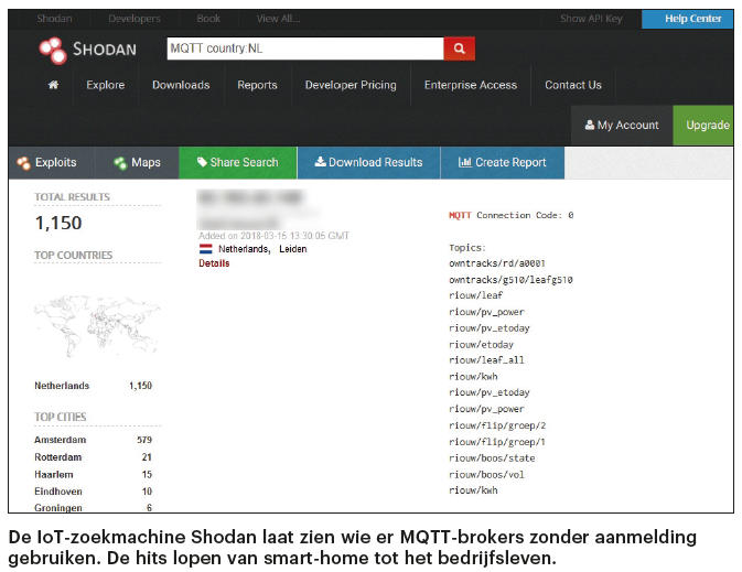 Zonder verdere maatregelen is al het MQTT-verkeer net zo veilig of onveilig als het netwerk waarover het verzonden wordt. Elk apparaat kan zich op alle topics abonneren en daarover berichten versturen. De berichten zijn niet versleuteld. Via een IoT-zoekmachine als Shodan kun je van buitenaf toegankelijke MQTT-toepassingen vinden. Gelukkig hebben de ontwikkelaars van MQTT beveiligingsfuncties ingebouwd. Meer hierover lees je in het MQTT-artikel in c’t magazine 5/2018. Daar lees je onder andere ook meer over poortinstellingen en apps voor MQTT.