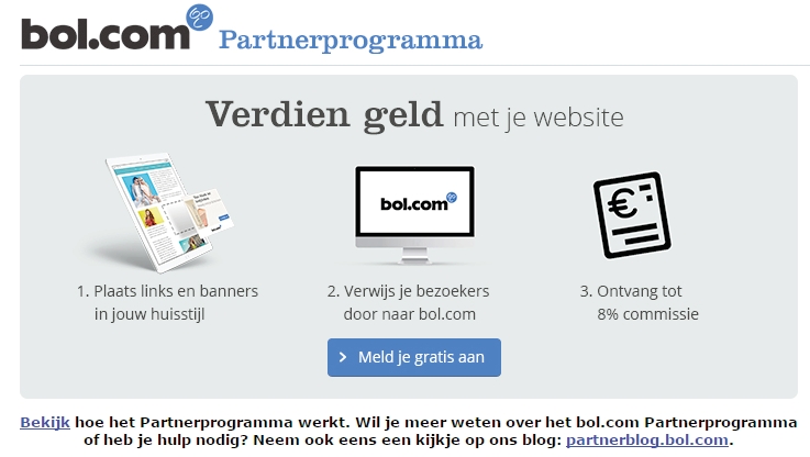 Bij affiliate marketing betaalt een commerciële aanbieder zijn partners commissie. Als partner krijg je verschillende reclamemiddelen tot je beschikking die je op je website kunt invoegen. Vaak mogen dat ook eenvoudige tekstlinks zijn. In Nederland is Bol.com een grote speler op dit gebied. Je maakt er een account aan en zet vervolgens links naar Bol-artikelen op je site met jouw siteID. Gebruikt een bezoeker deze link om iets te kopen, dan krijg je maximaal 8% commissie. Voor de klanten blijft de prijs gewoon gelijk.