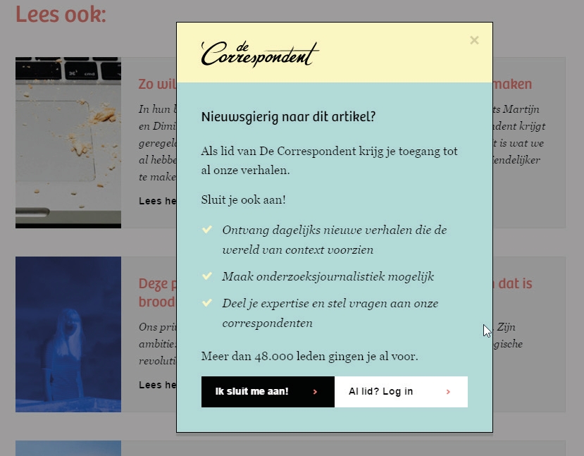 Met een betaalmuur kunnen je bezoekers bepaalde content alleen tegen betaling lezen. Lezers kunnen een abonnement nemen of per artikel betalen en daarvoor hun betalingsgegevens opgeven. Grote kranten als De Standaard, De Telegraaf, NRC en de Volkskrant werken allemaal met een model waarbij je een abonnement nodig hebt om naast het snelle nieuws ook de diepgaandere artikelen te mogen lezen. Bij bijvoorbeeld De Correspondent is alle content alleen voor abonnees, op een paar voorbeeldartikelen na. Van veel kranten en tijdschriften kun je ook losse artikelen kopen via platforms als Blendle.
