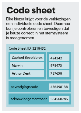 Dat zou bijvoorbeeld kunnen met zogeheten ‘return codes’. Daarvoor krijg je tegelijk met je toegangsgegevens en stempas nog een papier met een tabel met kandidatennamen en random codes (een ‘code sheet’). In deze tabel vind je achter elke kandidaat een bijbehorende return code. Deze return codes zijn daarvoor van tevoren willekeurig gegenereerd: elke kiezer krijgt een eigen code sheet met unieke codes. Het moet geheim blijven welke kiezer welke code sheet gekregen heeft.