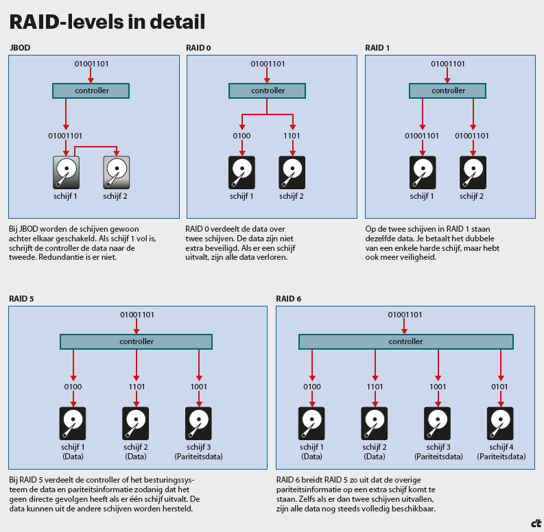 In de praktijk worden drie RAID-levels het meest gebruikt: RAID 0, 1 en 5. Verder heb je nog RAID 6 en JBOD. Windows biedt daarnaast vanaf versie 8.1 de functie Storage Spaces (Opslagruimten) en onder Linux heb je nog mdadm, LVM en bestandssystemen met geïntegreerde redundantie.