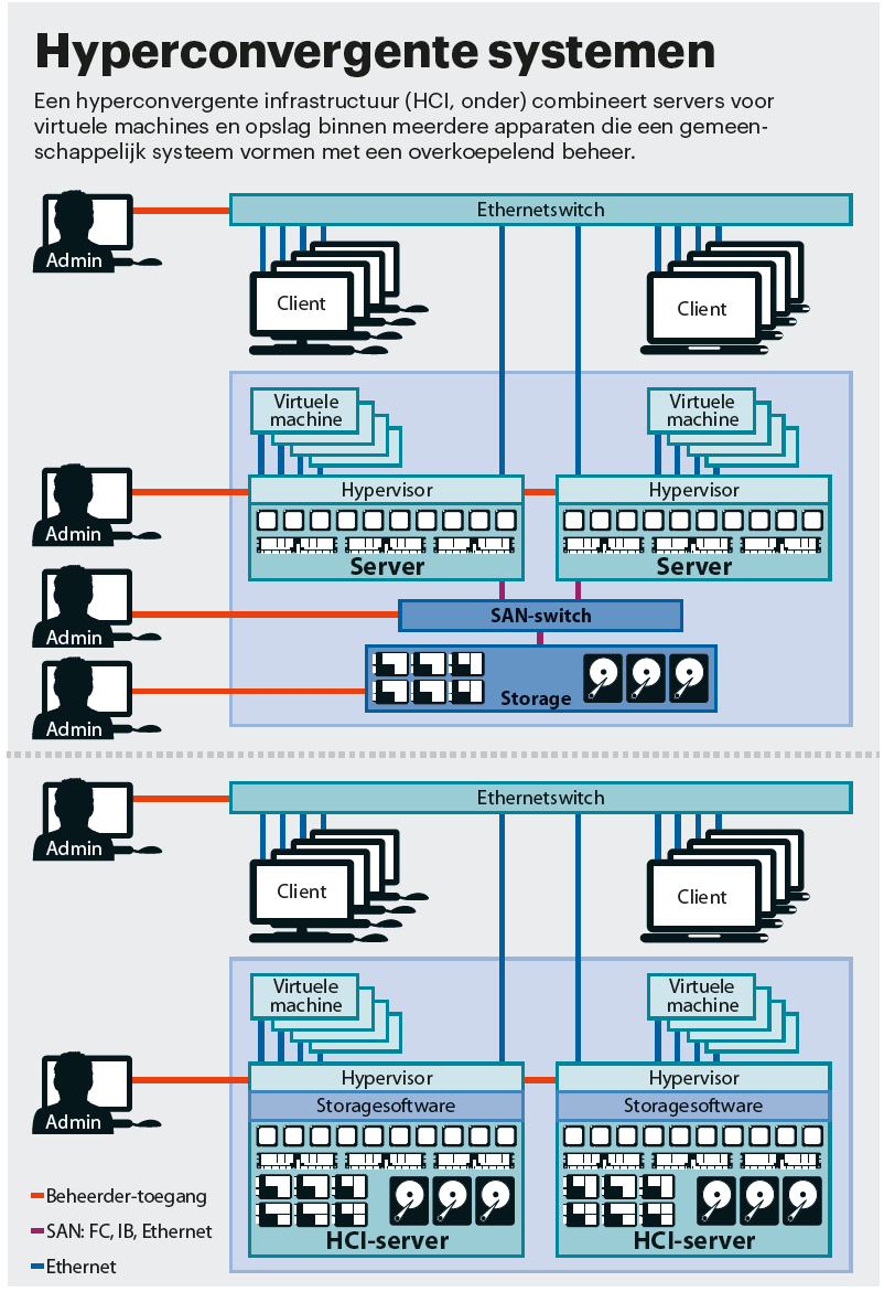 Het zijn buzzwords in de serverwereld: hyper-converged servers en hyper-converged infrastructure (HCI). In feite gaat het om servers met eigen opslag in de vorm van ssd’s en harde schijven – dus geen centrale opslag. Maar het betekent zoveel meer…