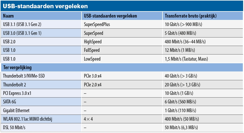 USB 3.1-hubs met Super-SpeedPlus zijn er op dit moment nog niet. De huidige hubs komen niet verder dan SuperSpeed. Deze mogen toch de naam ‘USB 3.1’ dragen, al moet daar wel Gen1 aan toegevoegd worden. Let daar dus goed op! Daar moeten we wel bij zeggen dat er ook nog maar een paar dure opslagmedia zijn die SuperSpeed Plus helemaal benutten. Supersnel bestanden kopiëren werkt bovendien alleen als ook de host een bijzonder snel opslagmedium heeft. Een harde schijf is daarvoor veel te langzaam, zelfs een SATA-6G-ssd is niet snel genoeg. Pas met een NVMe-ssd of sneller kun je de snelheid benutten. Dat geldt nog sterker bij Thunderbolt-randapparaten: extreme datasnelheden van meer dan 1 GB/s zijn alleen voor speciale doeleinden zinvol.