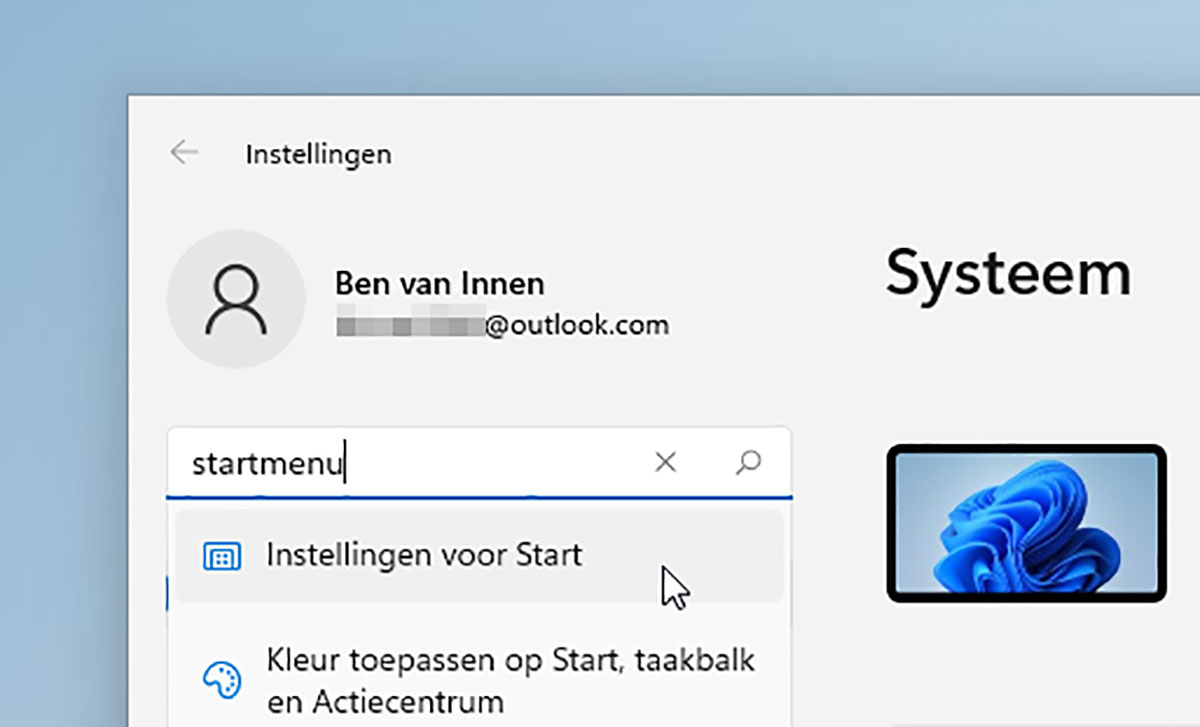 Zoek naar startmenu om het onderdeel ‘Persoonlijke instellingen / Start’ te openen.