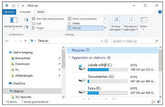 Om in te kunnen schatten of je al aan de slag moet, kun je een snelle blik op Verkenner werpen: als je op ‘Computer’ (Windows 7) of ‘Deze pc’ klikt (Windows 10) en bij ‘Beeld’ vervolgens ‘Inhoud’ selecteert, zie je een overzicht van hoe vol alle schijven zijn.