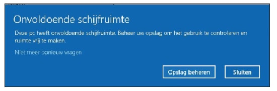 Doorgaans maak je je pas zorgen over de schijfruimte als de eerste foutmeldingen verschijnen. Dan is het ook echt tijd om wat te gaan doen, want anders kan Windows bijvoorbeeld geen updates meer installeren en blijven security-lekken wijd openstaan, zelfs als daar allang patches voor zijn. Bovendien schakelt Windows bijvoorbeeld het systeemherstel en bepaalde energiespaarstanden uit. Windows kan dan alleen nog volledig afsluiten of overgaan naar de Sluimerstand (Suspend tot RAM, S3), maar niet meer naar de Slaapstand (Suspend to Disk, S4), waarbij de pc geen stroom meer nodig heeft. Ook probeert Windows om zelf bestanden te verwijderen die het als overbodig beschouwt.