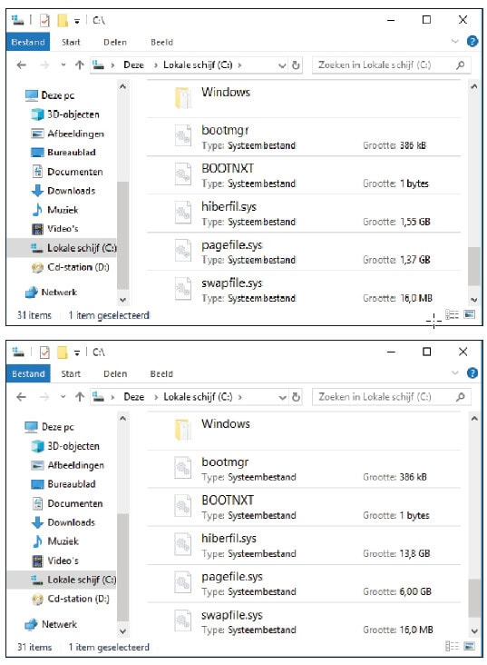 Het kan wellicht als een verrassing komen dat zelfs een hardwareupdate tot minder vrije schijfruimte kan leiden, en niet alleen omdat er een extra driver geïnstalleerd moet worden. Als je bijvoorbeeld geheugen toevoegt, vergroot Windows het bufferbestand pagefile.sys en het slaapstandbestand hiberfil.sys. Op een testsysteem ging de benodigde schijfruimte voor die twee bestanden bij een 64-bit installatie van Windows 10 Home Edition bij een upgrade van 4 naar 32 GB van ongeveer 3 GB naar meer dan 18 GB.