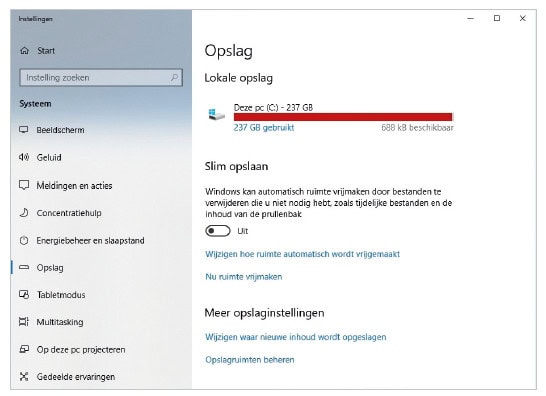 Zo lang er nog 100 GB of meer vrij is, hoef je de ruimtevretende programma’s of bestanden nog niet meteen heel rigoureus te lijf te gaan, maar volstaat het om af en toe te kijken of de vrije ruimte op schijf hinderlijk minder wordt. Als er niet zo veel meer over is, moet je bedenken of je programma’s zuinig zijn qua opslagruimtegebruik of niet. Pas als de vrije ruimte slinkt tot minder dan 10 tot 20 GB of er foutmeldingen van Windows of van andere programma’s verschijnen, wordt het tijd om de schijf eens te ontdoen van onnodige bestanden.