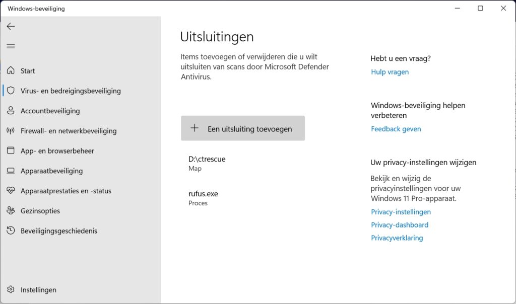 Als je het rescuesysteem gebouwd hebt, moet je de uitzonderingen weer verwijderen. Bij Defender doe je dat via ‘Instellingen / Privacy en beveiliging / Windows-beveiliging’, klik dan op ‘Virus en bedreigingsbeveiliging’ en ga onderaan naar ‘Instellingen beheren’. Scrol naar beneden naar Uitsluitingen en klik op ‘Uitsluitingen toevoegen of verwijderen’.