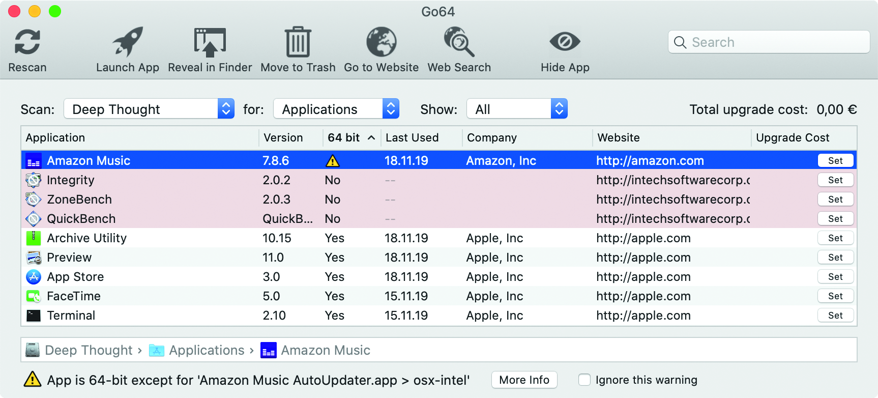 Dat is precies waar de gratis app Go64 van St. Clair Software voor gemaakt is. Die app scant je systeemschijf en toont vervolgens welke toepassingen nog 32-bit of gedeeltelijk 32-bit zijn. Bovendien toont de tool ook meteen een link naar de website van de softwareproducent om een nieuwe versie te downloaden.