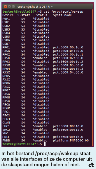 zet je de wake-upfunctie uit. Doe dat met alle apparaten in de lijst die een ‘enabled’ achter zich hebben staan en kijk of het stroomverbruik op stand-by afneemt. Je zou een langere accuduur moeten halen. De laatste kolom geeft overigens informatie over welk PCI-device achter de afkorting schuilgaat. Om de instellingen permanent te maken, zet je de commando’s om de wake-upfuncties uit te schakelen in het bestand /etc/rc.local. Dan worden ze bij het opstarten uitgevoerd.