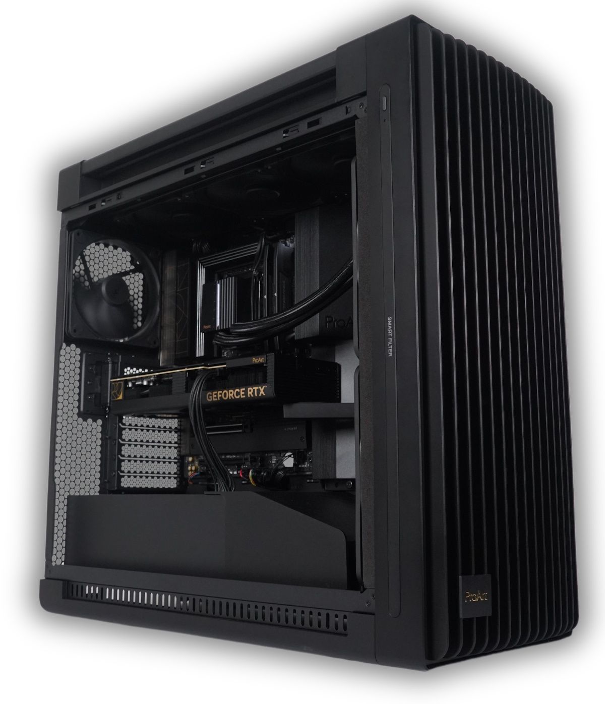 Dat alles zit in een ASUS ProArt PA602-behuizing, met kleine wieltjes om verplaatsen makkelijker te maken plus diverse eenvoudig te verwijderen en schoon te maken stoffilters. Het workstation wordt uitgeleverd met Windows 11 Pro.