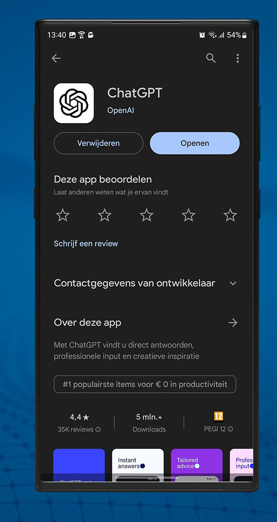 Wanneer je in de Play Store zoekt naar ‘ChatGPT’, word je overspoeld met allerlei apps met chatbots. Geen zin om zelf te zoeken naar de app? Via deze link kun je hem downloaden op de Google Play Store.