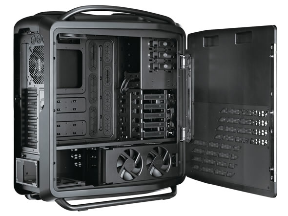 De geïsoleerde dubbelwandige zijpanelen zwaaien met één druk op de knop open als een autodeur en zijn makkelijk uit de scharnieren te lichten. De luxueuze kast is verdeeld in twee gescheiden compartimenten en aan alle kanten voorzien van ruime kabeldoorgangen. In het onderste deel zit een via de achterzijde toegankelijke ruimte voor de voeding en is plaats voor zes 3,5″-harddisks. In het bovenste gedeelte komt het moederbord (10 expansion slots) plus een drivebay voor nog eens 5 harddisks en twee wisselframes voor harde schijven. Daarboven zitten nog drie 5,25″-bays. Alle harde schijven, behalve die in de wisselframes, zijn dwars gemonteerd. Alle drives worden schroefloos gemonteerd, wat lekker snel werkt. De maximale hoogte voor de cpu-cooler is 190 mm en de maximale lengte voor de grafische kaart(en) is 385 mm, ruim genoeg dus.