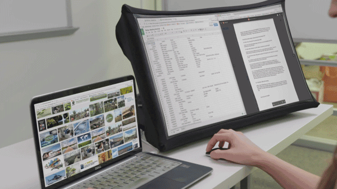 De SPUD, oftewel the Spontaneous Pop-up Display, is een 24″-scherm dat zich laat opvouwen als een paraplu. Aan de achterkant zit een speciale kleine beamer.