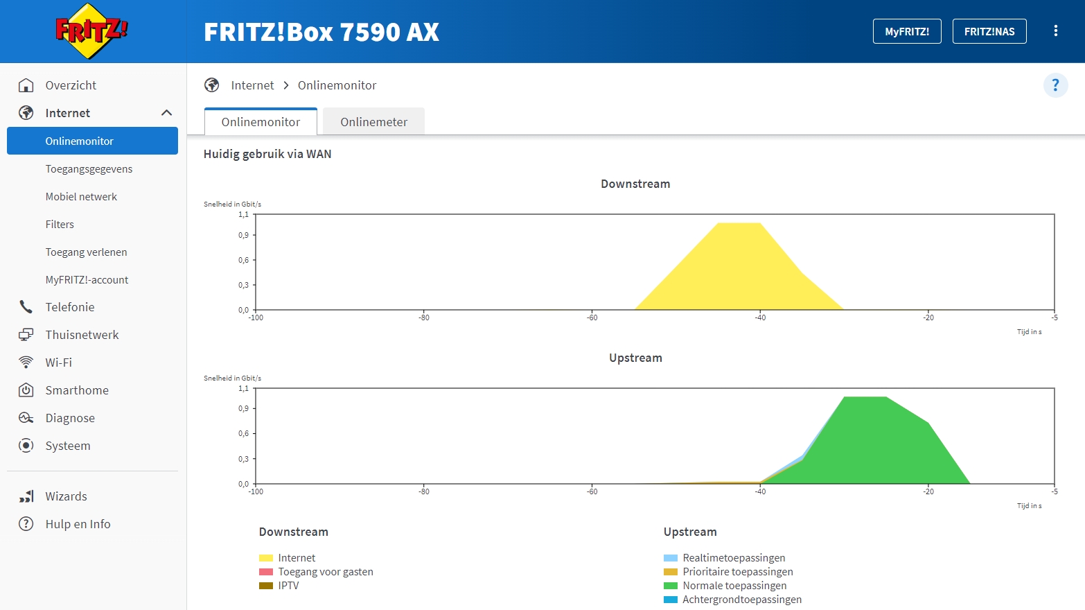 Hoeveel er op een bepaald moment wordt gedownload en geüpload, kun je bij een FRITZ!Box bekijken bij ‘Internet / Onlinemonitor’ op het tabblad Onlinemonitor.