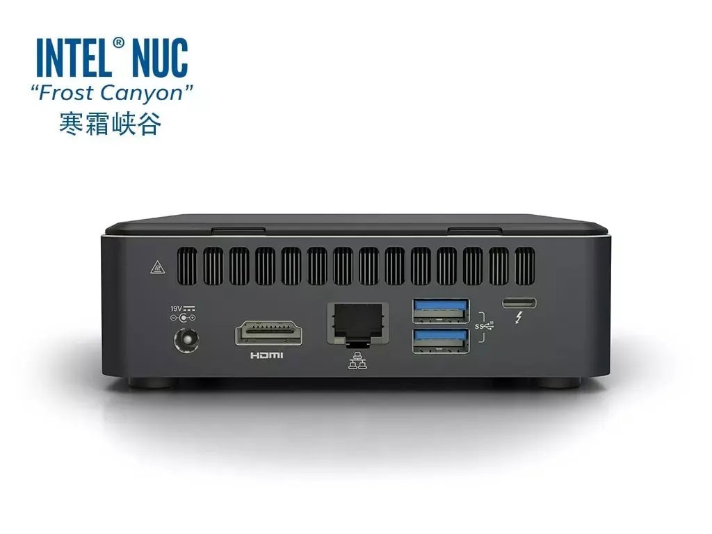 De aansluitingen zullen verder grotendeels hetzelfde blijven: bij de nieuwe generatie Frost Canyon vervangt Intel volgens de fotoś alleen de tweede USB-A-poort aan de voorkant door een USB-C-poort – met een USB-3.2-Gen-2-snelheid (10 Gbit/s). Twee andere USB-A-poorten (10 Gbit/s) zitten aan de achterkant.