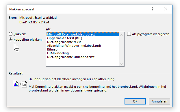 Open daarvoor in Excel de werkmap die de tabel bevat die je wilt koppelen, selecteer het gewenste celbereik, en kopieer dit met de toetsencombinatie Ctrl+C of door op ‘Kopiëren’ te klikken in het tabblad ‘Start’ van het lint. Ga dan naar het Word-document en plaats de cursor op de plek waar je de tabel wilt invoegen. Klik op de pijl onder de knop ‘Plakken’ op het tabblad ‘Start’ en kies ‘Plakken speciaal’. In het gelijknamige dialoogvenster markeer je het keuzerondje ‘Koppeling plakken’ en selecteer je de optie ‘Microsoft Excel-werkblad-object’.