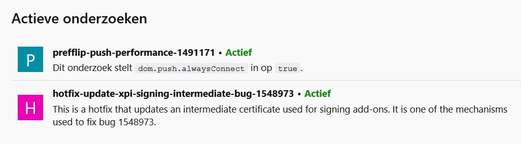 Voor de Release-, Beta- en Nightly-varianten van de Firefox-desktopversies is er een update. Dat kun je bij een standaardinstallatie ook activere, dan heb je de update binnen een paar uur binnen. Dat doe je bij ‘Privacy & Beveiliging / Firefox-gegevensverzameling en -gebruik’. Daar staat bij ‘Firefox-onderzoeken weergeven’ dan ‘hotfix-update-xpi-signing-intermediate-bug-1548973’. Dat staat gedetailleerd beschreven in een blog.