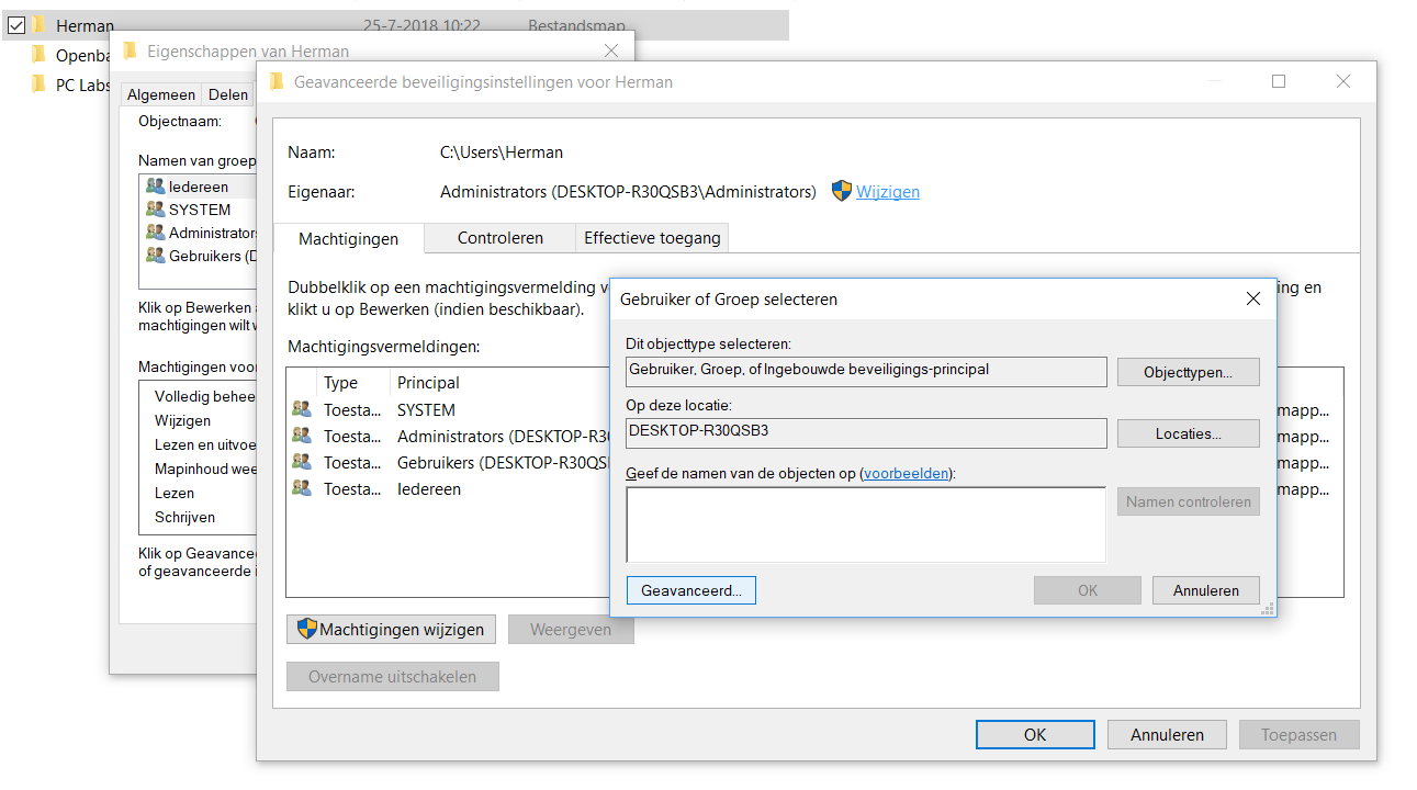 Ga in Verkenner naar de map waarvoor je toegang wilt hebben. Klik daar met rechts op en in het snelmenu op ‘Eigenschappen’. Ga naar het tabblad ‘Beveiliging’ en klik op ‘Geavanceerd’. In het dialoogvenster klik je op de knop ‘Wijzigen’ rechts op de regel ‘Eigenaar’. Dan worden er steeds meer dialoog vensters geopend. Klik bij ‘Gebruiker of groep selecteren’ onderin op ‘Geavanceerd’, op ‘Nu zoeken’ en selecteer je huidige gebruikersaccount. Klik daarna tweemaal op ‘OK’. Nu kun je een vinkje zetten bij ‘Eigenaar van onderliggende containers en objecten vervangen’. Doe dat en klik op ‘Toepassen’.