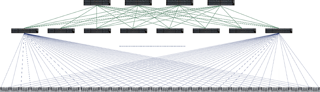 Vervolgens worden de leaf- en spine-switches verbonden om een fat-tree te vormen. Deze uitbreiding naar de toplaag volgt een gelijkaardig concept als het verbinden van servers met leaf-switches. Poorten van elke bladschakelaar worden gelijkmatig verdeeld over de spine-switches, waardoor een top-layernetwerk wordt gevormd.