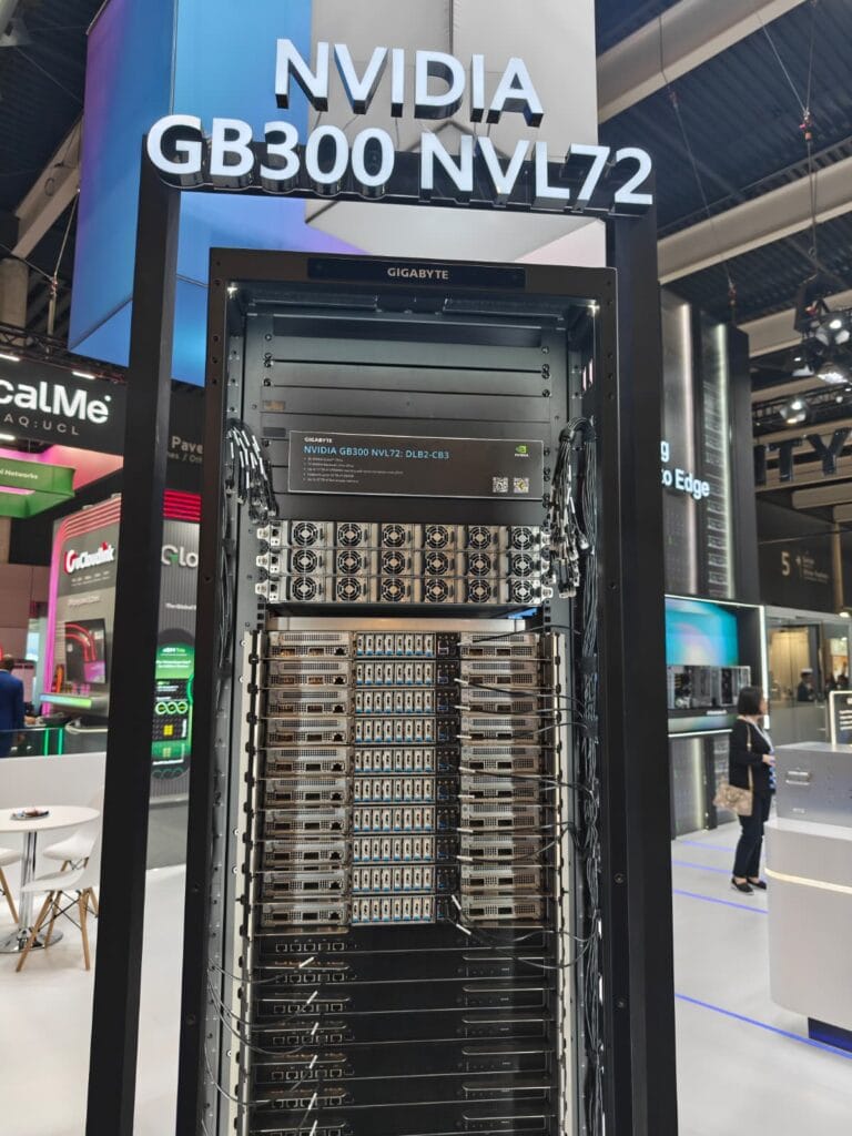 Hardwareleveranciers zoals Gigabyte, Supermicro, HPE en Dell toonden servers en werkstations die specifiek zijn ontworpen voor AI-workloads. Op de stand van Gigabyte waren onder meer GPU-servers te zien voor grootschalige AI-training, waaronder systemen gebaseerd op Nvidia’s GB300 NVL72-platform, waarbij tientallen GPU’s in één rack worden gecombineerd.