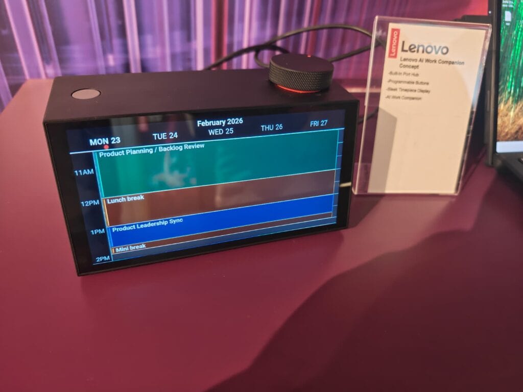 Naast consumentenelektronica werden ook proof of concepts getoond. Lenovo presenteerde bijvoorbeeld een AI Work Companion, een compact bureauapparaat met een klein display en een programmeerbare draaiknop. Het systeem kan agenda-informatie, meldingen en andere contextuele data tonen en is bedoeld als persoonlijke assistent voor werkplekken.