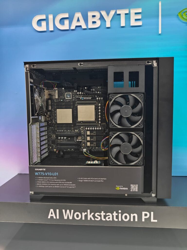 Daarnaast presenteerde Gigabyte ook compactere systemen voor lokale AI-ontwikkeling, zoals de AI Workstation PL. Dit type workstation combineert GPU-acceleratie met serverhardware, zodat ontwikkelaars AI-modellen lokaal kunnen trainen of testen zonder afhankelijk te zijn van externe datacenters.
