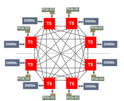 Oracle is vooral trots op een nieuw snooping- en transactionprotocol. Daarmee gaan aanvragen tegelijkertijd naar de DRAM-controller en naar knopen verderaf, waardoor de latentie tot 31 procent minder wordt. Al met al is de beschikbare bandbreedte indrukwekkend. Zo leveren de verbindingen naar het werkgeheugen meer dan 1 TB/s, via het coherentienetwerk blijft daar nog 840 GB/s van over en via PCIe 3.0 256 GB/s. Dankzij diverse optimalisaties van de processor voor Oracles eigen software gaat de fabrikant uit van een vrijwel perfecte performanceschaling van een tot acht sockets, zelfs als bij OLTP-operaties communicatie tussen de knopen nodig is.