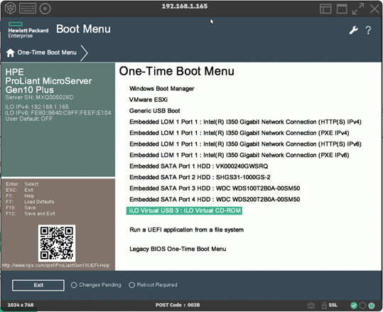 Zodra het eenmalige opstartmenu op het scherm verschijnt selecteer je iLO virtual CD-ROM om te booten vanaf het ISO-bestand:
