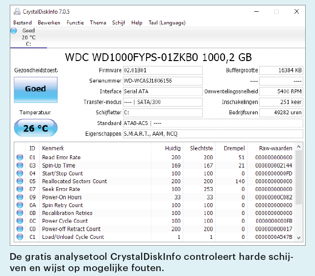 Mocht ook dat niet helpen, dan kan het aan de schijf zelf liggen. Installeer een tool als het gratis CrystalDiskInfo, selecteer daarin de harde schijf en kijk naar opvallende resultaten. Eigenlijk moeten harde schijven hun gezondheid melden via SMART (Self-Monitoring, Analysis and Reporting Technology), maar als alleen de eerste sectoren nog maar beginnen te haperen, kan de schijf toch melden dat hij ‘OK’ is.