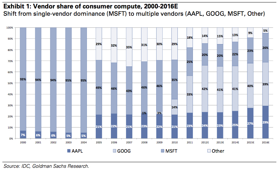 Volgens een onderzoek van Goldman Sachs in samenwerking met IDC staat tegenwoordig op nog maar op 20 procent van de privé gebruikte computers een besturingssysteem van Microsoft. Dat maakte de Seattle Times bekend. In 2000 had Microsoft op de consumentenmarkt nog een aandeel van 93%.