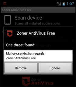 Een van de tests laat het probleem goed zien. De onderzoekers confronteerden Zoner AntiVirus voor Android met een vervalste signature die bij de app zelf paste. De app zag zichzelf daarop prompt als bedreiging en bood aan zichzelf te verwijderen.