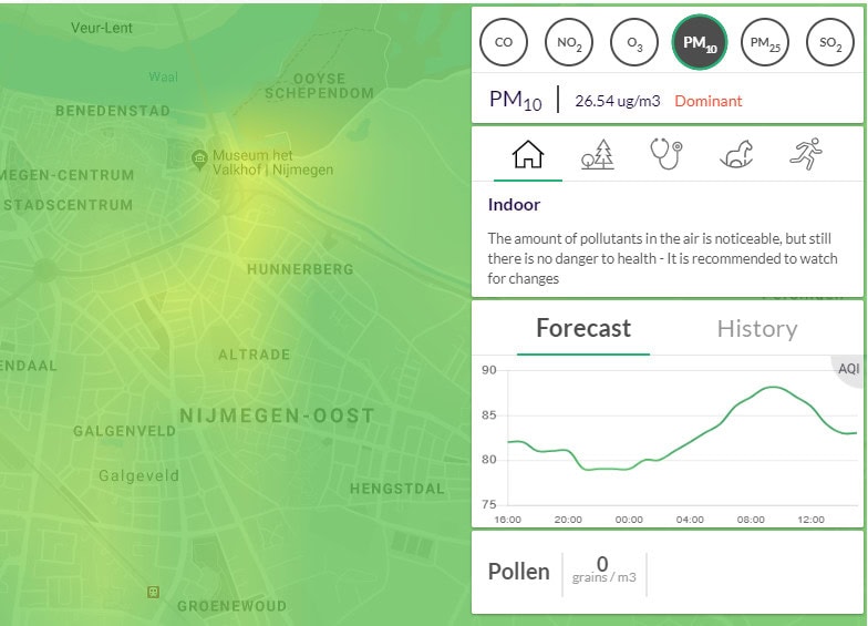 Met de live-map van breezometer.com zie je voor een locatie behoorlijk gedetailleerd hoe het met verschillende waarden in de lucht gesteld is. De meetwaarden worden omgezet in meldingen voor indoor, outdoor, mensen met gevoelige luchtwegen, kinderen en of het slim is om buitenshuis te gaan sporten.