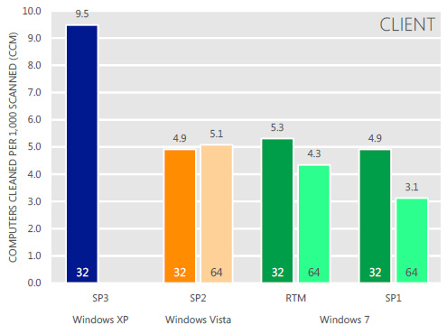 Microsoft vermeldt in haar Security Intelligence Report over de eerste helft van 2012 dat het van systemen met Windows XP ongeveer twee keer zo vaak schadelijke software heeft verwijderd dan bij Windows 7 of Vista. Bij ongeveer één procent van de uitgevoerde tests met de Malicious Software Removal Tools (MSRT) op Windows XP ontdekte de rudimentaire scanner een virus (9,5 van 1000). Bij de nieuwere Windows-versies is dit percentage maar ongeveer 0,5 procent.