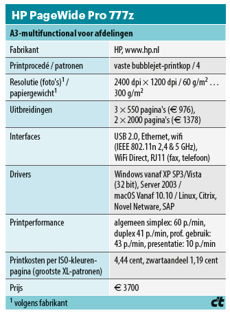 De HP PageWide Pro 777z is een snelle A3-formaat all-in-one voor werkgroepen. Het is een inkjet, maar met zijn vaste printkop print hij sneller en goedkoper dan de meeste laserprinters.